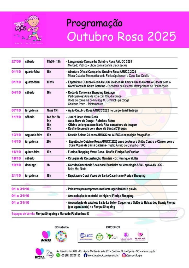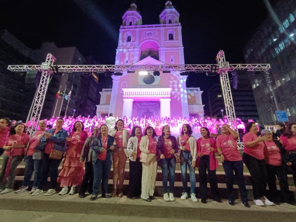 - Cultura: O Centro Integrado de Cultura (CIC) se iluminou de rosa, e voluntárias da AMUCC marcaram presença no show da Camerata Florianópolis, onde cerca de mil pessoas receberam folhetos.