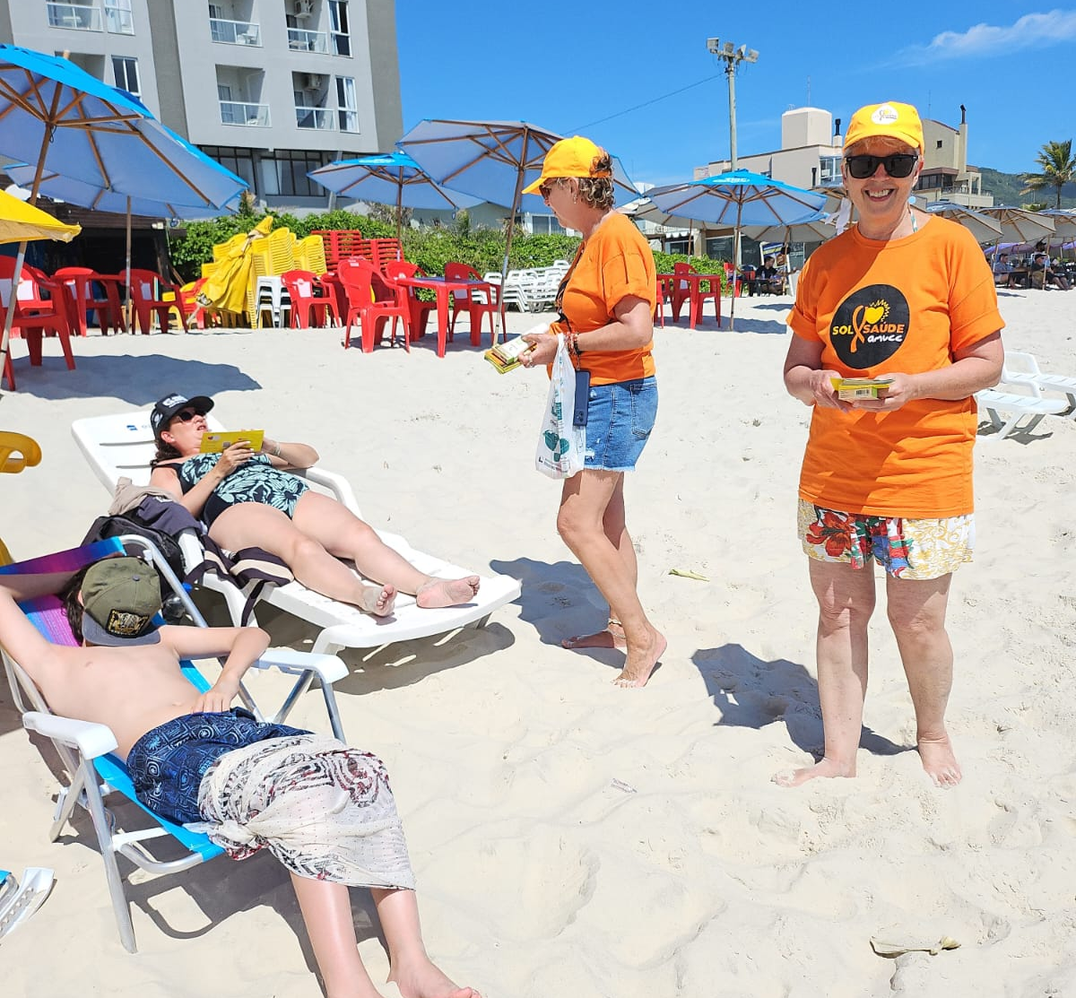 - Houve distribuição de brindes como bonés, incentivando a proteção física contra o sol.