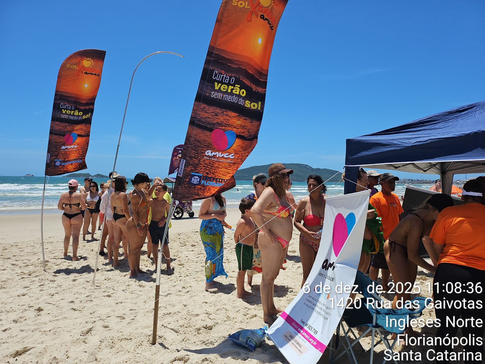 A AMUCC realizou, no último sábado, dia 06 de dezembro de 2025, a ação de conscientização e prevenção do câncer de pele “Sol e Saúde” na Praia dos Ingleses, em Florianópolis. O evento superou as expectativas, destacando-se pelo forte impacto na comunidade e pelo apoio essencial de profissionais de saúde.