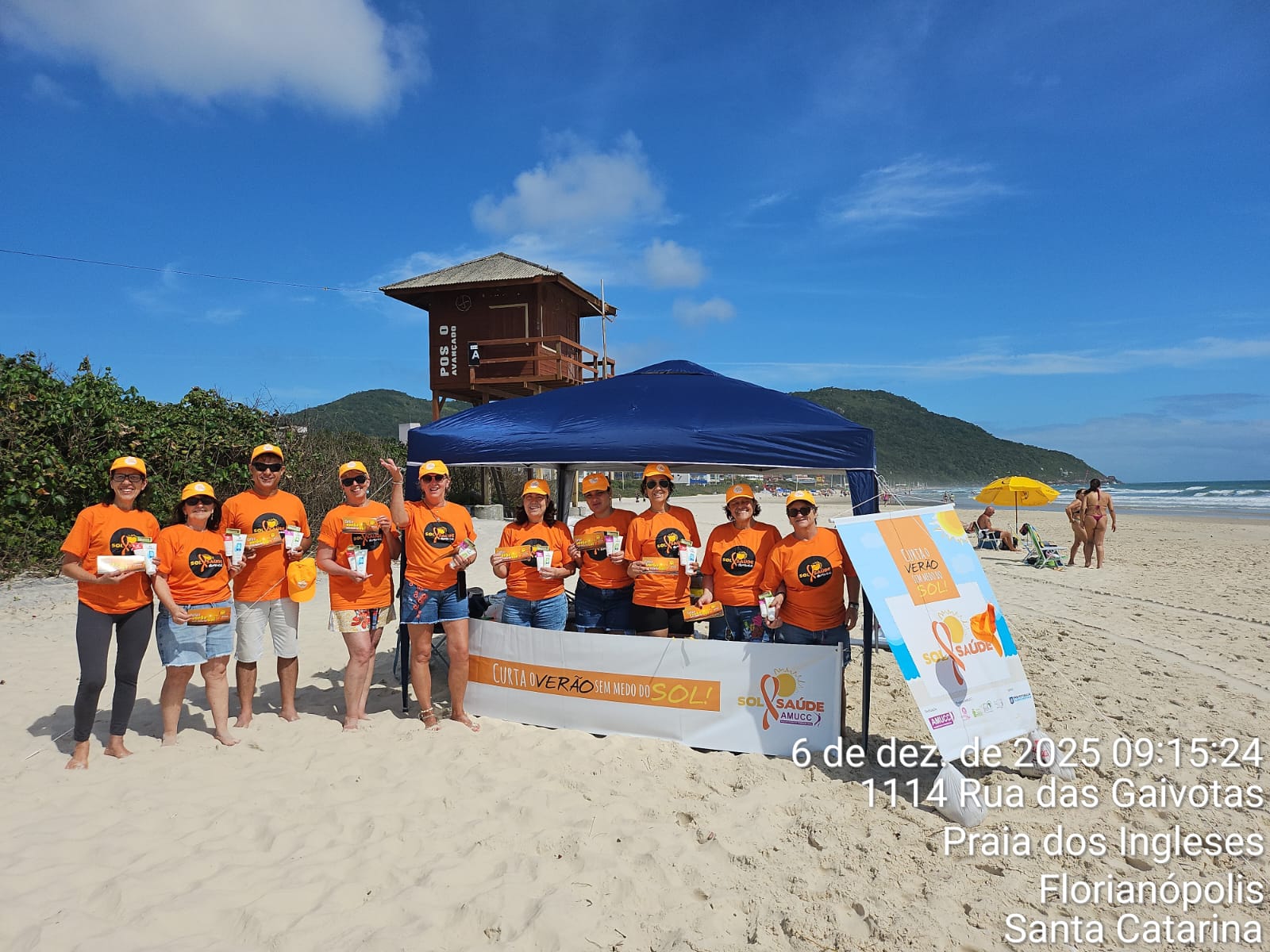 A ação, que ocorreu das 9h às 17h, mobilizou 15 voluntários da AMUCC, que estiveram na areia da praia (altura do número 1300 da Rua das Gaivotas) para abordar banhistas e ambulantes, distribuindo informações vitais sobre os cuidados com o sol e a prevenção do câncer de pele.